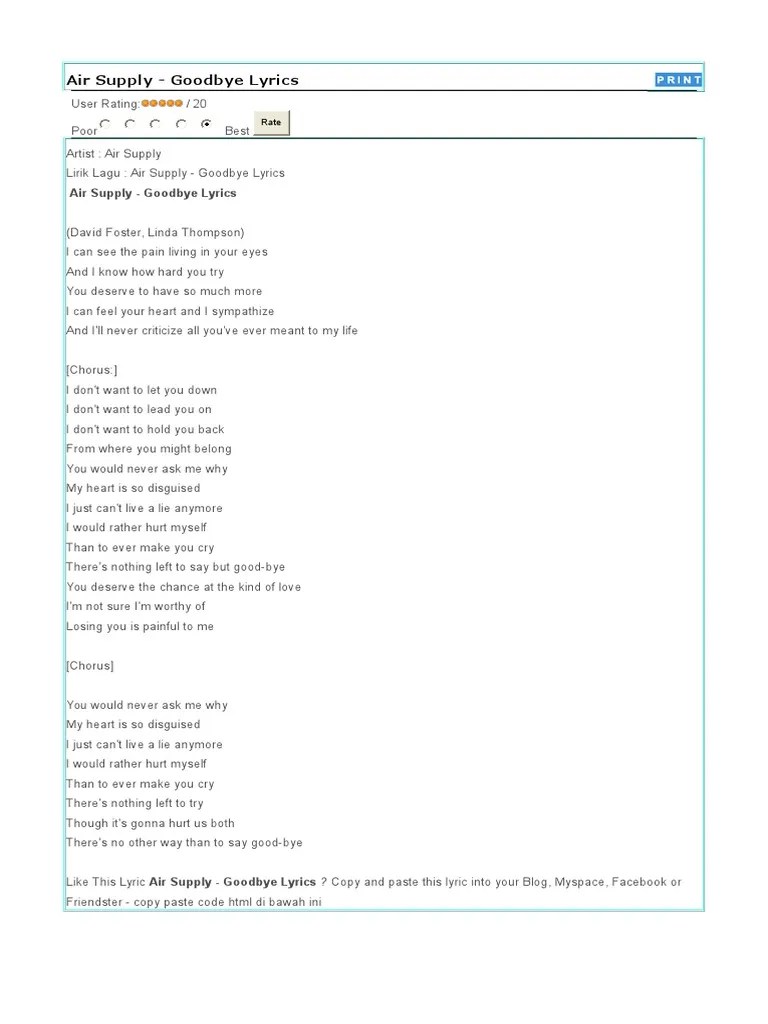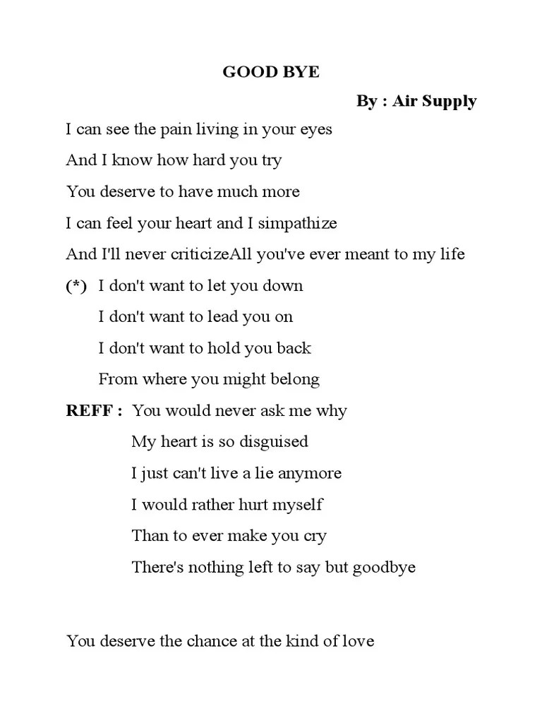 Lirik lagu nostalgia yang berjudul air supply 'good bye', you would never ask me why. Berikut ini adalah lirik lagu air . I don't want to lead you on. Download lagu terbaru 2019 mudah, cepat, nyaman. I can see the pain living in your eyes aku bisa melihat penderitaan yang bersemayam di matamu